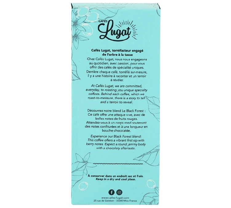 Ce café Black Forect est un café de spécialité, mélange d’arabicas du Brésil et de l’Ouganda. Les plantations de Mundo Novo, Catuai, et Moka regorgent de grains de café récoltés à la main entre 1600 et 1800m d’altitude. Chaque grain est ensuite torréfié en France, dans nos ateliers, par nos équipes de torréfacteurs.
