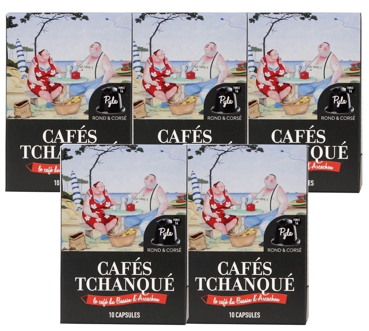 Dégustez ces capsules compatibles Nespresso® Pyla des Cafés Tchanqué. Ce mélange rond et corsé, issu du Kenya et du Cameroun est conçu et torréfié en France. Conditionné en 5 boîtes de 10 capsules 100% hermétiques sans emballage superflu (chérissons notre planète !).