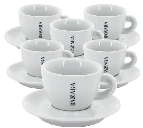 Lot de 6 tasses cappuccino et sous-tasses en porcelaine blanche de la marque Bazzara . Ce lot de tasses et sous tasses allient modernité et qualité haut de gamme, de plus elles passent au lave vaisselles.