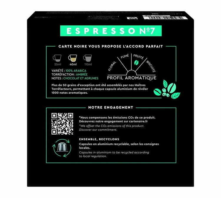 Ces capsules Carte Noire sont faites en aluminium recyclable afin de limiter votre impact environnemental. Elles ont reçu le label 0 Impact CO².