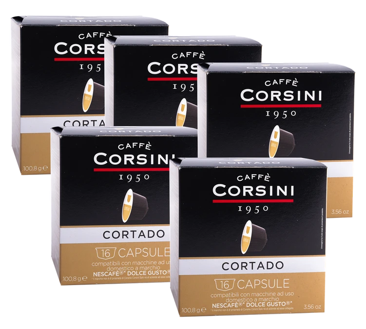 Découvrez ces capsules compatibles Nescafe® Dolce Gusto® Cortado de Caffè Corsini composées de café et de poudre de lait. Vous aurez une boisson lactée qualitative en un rien de temps. Conditionnement : 5 boîtes de 16 capsules. Livraison gratuite !