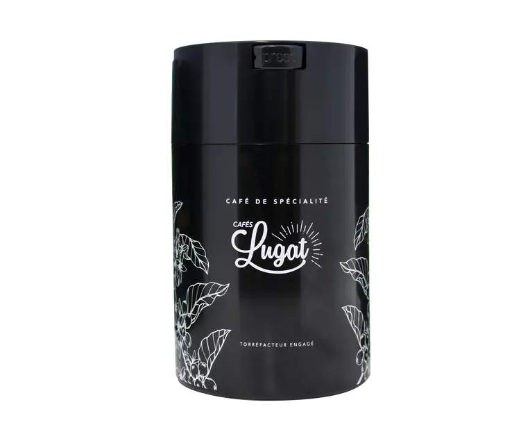 Découvrez la boîte conservatrice Cafés Lugat (1kg/3,8L). Avec une simple pression, l’air est évacué de la boîte pour vous permettre de conserver bien plus longtemps votre café.