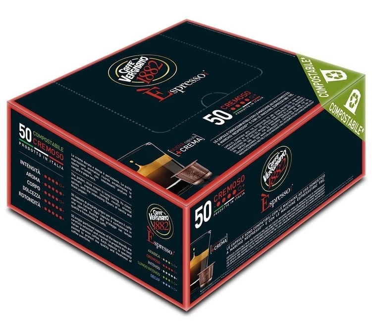 50 capsules biodégradables et compostables Espresso Crémoso de la marque Caffe Vergnano. Ce café corsé offre une mousse épaisse et persistabte en tasse. Ces capsules sont compostables industriellement. Capsules compatibles avec les compatibles Nespresso®.