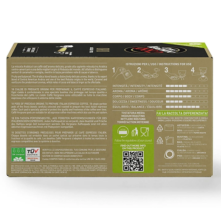 Les dosettes ESE Orode Caffé Vergnano sont conditionnées par 18 unités : ce mélange est un café crémeux, riche en arôme et en goût comme celui du bar. Conditionnement : 5 boîtes de 18 dosettes ESE.