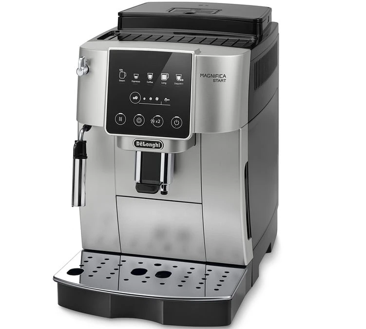 La Gamme de machines Ă cafĂ© Ă grain DeLonghi Magnifica se rĂ©invente avec les Magnifica START. Sa carrosserie en ABS argent est rehaussĂ©e par des touches d’inox et de noir, notamment sur la buse vapeur.