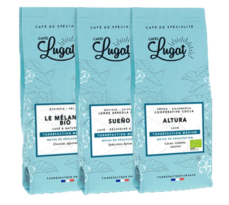 En cadeau avec ce kit de démarrage Bluecup, nous vous offrons 3 paquets de café moulu BIO 250 g de la marque Cafés Lugat :