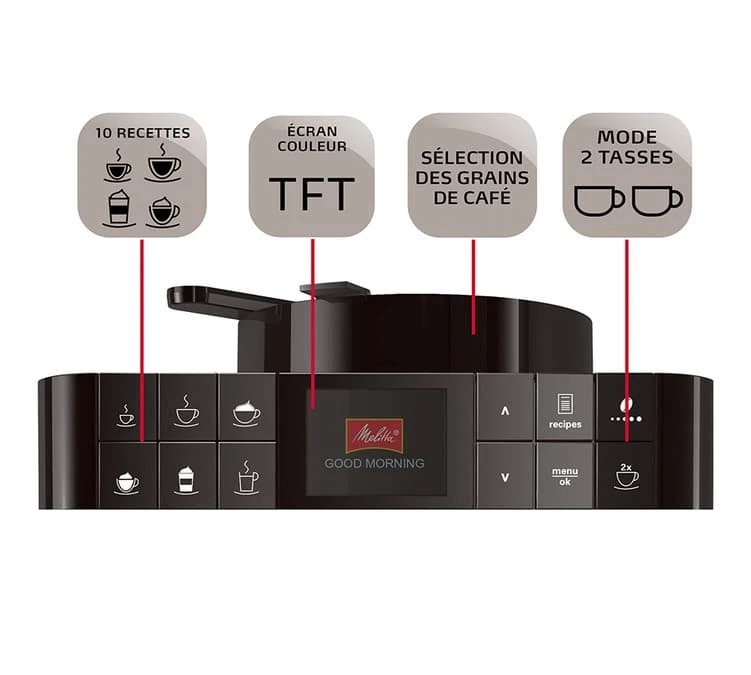 La fonction One-Touch permet, sur simple pression d’une touche, de réaliser toutes boissons lactées avec une extrême facilité , de manière totalement reproductible, sans toucher à votre tasse :