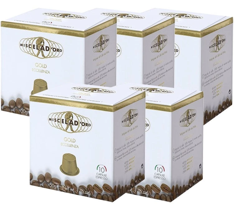 Découvrez les capsules Gold de Miscela d’Oro, un mélange de café 100 % Arabica de qualité aux arômes intenses et délicats. Capsules compatibles Nespresso®. Conditionnement : 5 boîtes de 10 capsules.
