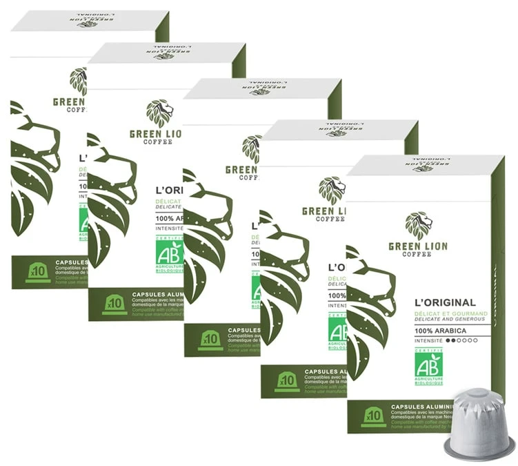 Découvrez ces capsules compatibles Nespresso® Green Lion Coffee. Ce mélange délicat et gourmand vous offre une tasse subtile avec des notes portées sur le pain grillé et sur le caramel. Vous allez apprécier sa longueur en bouche légèrement boisée. Conditionnement : 5 boîtes de 10 capsules