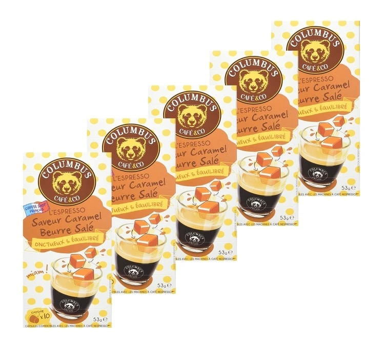 Découvrez ce lot de 50 capsules compatibles Nespresso® Saveur Caramel Beurre Salé de Columbus Café & Co. Cette recette de café , à l ‘arôme de caramel beurre salé, séduira les plus gourmands . Ces capsules sont 100% hermétiques, sans emballage superflu, conditionnées par boîte de 10.